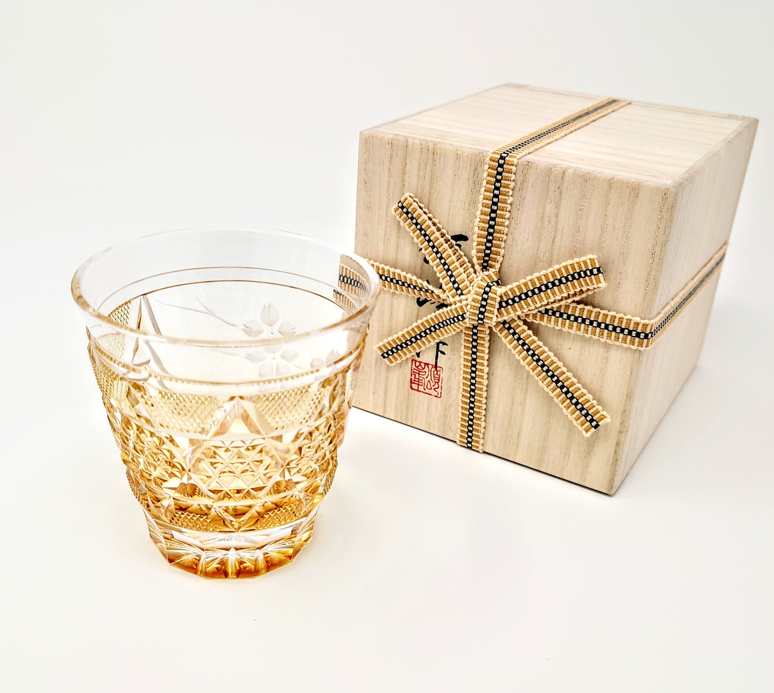ガラスアーティスト 頌峰(しょうほう)による、この作品 オールドロック(ロックグラス)「花やか」は、桜の花やかなデザインと、天開型の形状で、ゴールドな色が特徴。
