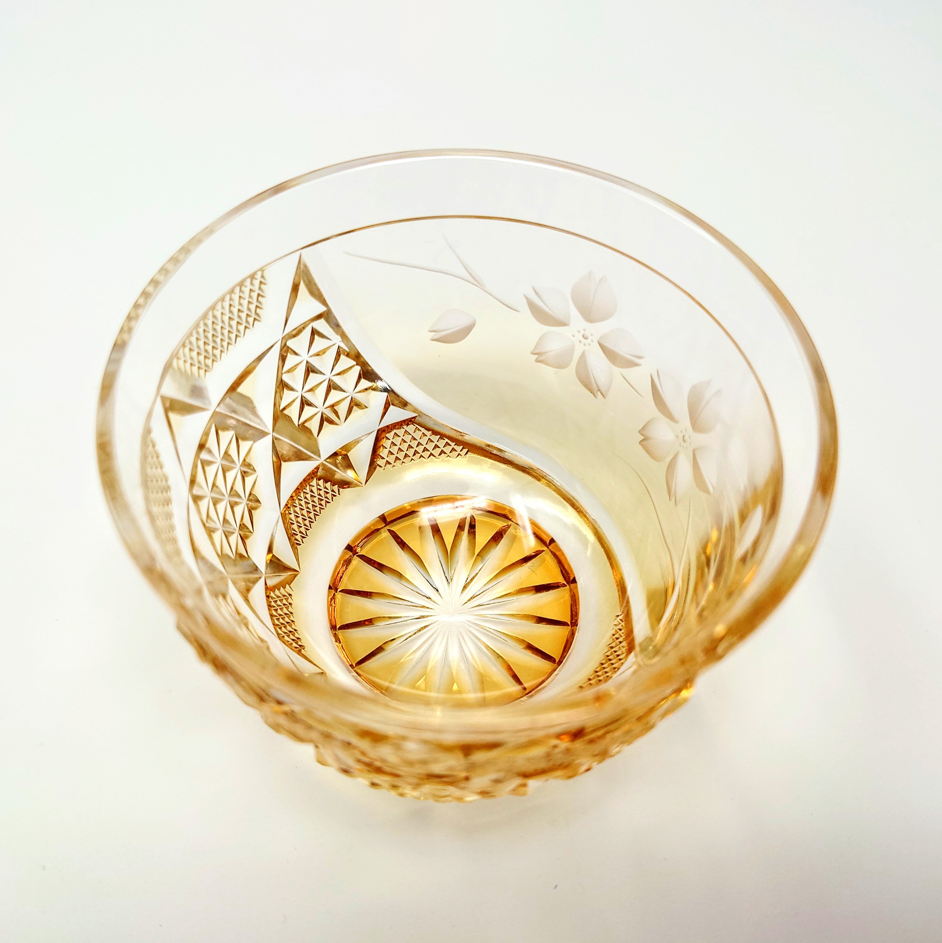 ガラスアーティスト 頌峰(しょうほう)によるこの作品は、贅沢な桜の花が咲き誇る「花やか」︰ゴールドの薩摩切子です。透明と、深みのあるアンバー色ゴールドとのグラデーションが施された、華やかな逸品です。