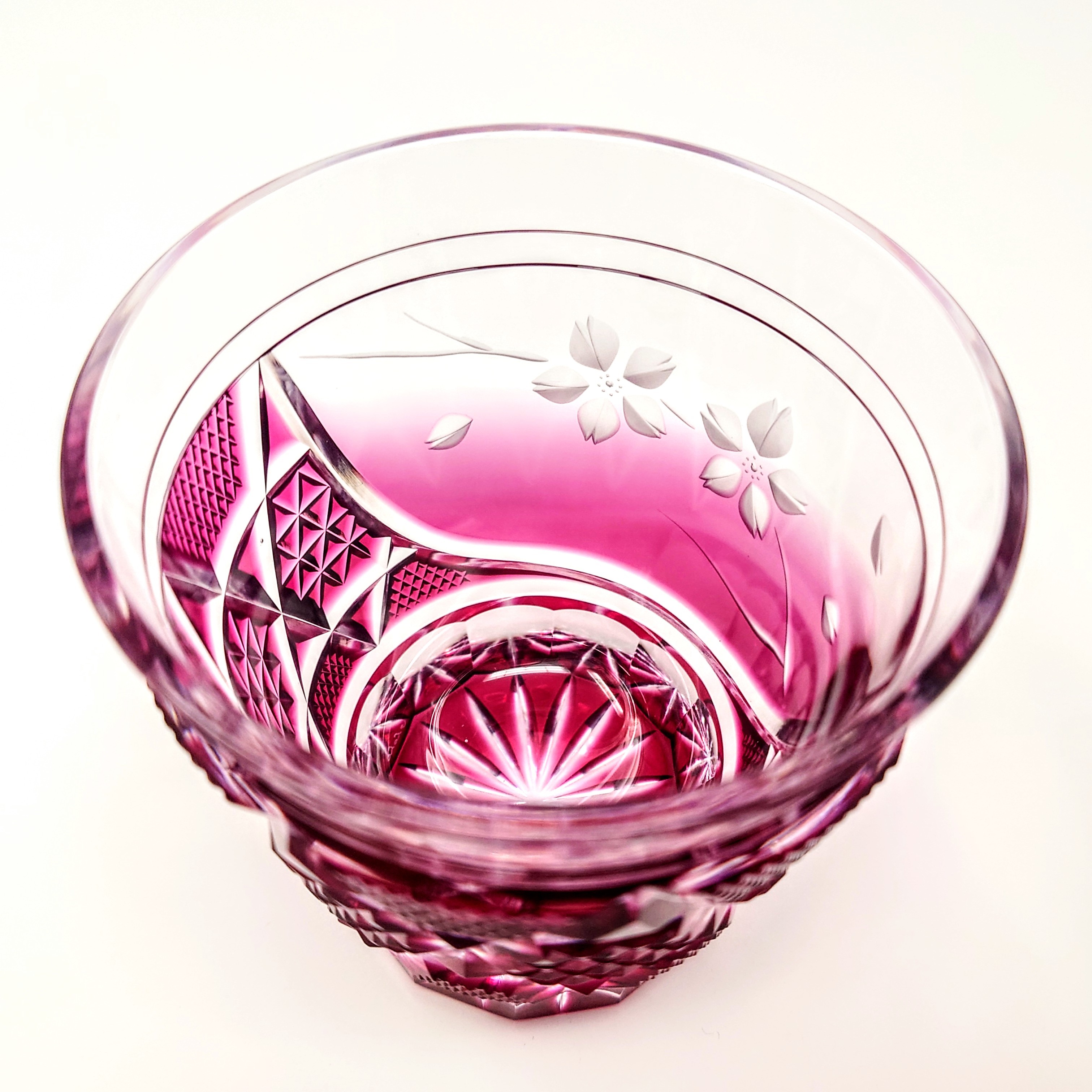 ガラスアーティスト 頌峰(しょうほう)による、この作品 オールドロック「花やか」は、桜の花やかなデザインと、天開型の形状で、赤色が特徴。